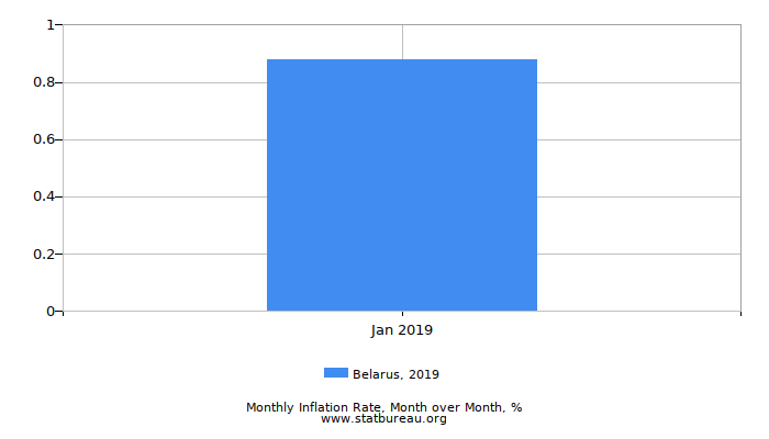 Monthly inflation rate in Belarus was 0.88% in January 2019. That is 0.10 more than it was in December 2018 and 0.13 more than in January 2018. At the same time, 2019 year to date inflation rate is 0.88% and year over year inflation rate is 5.78%.