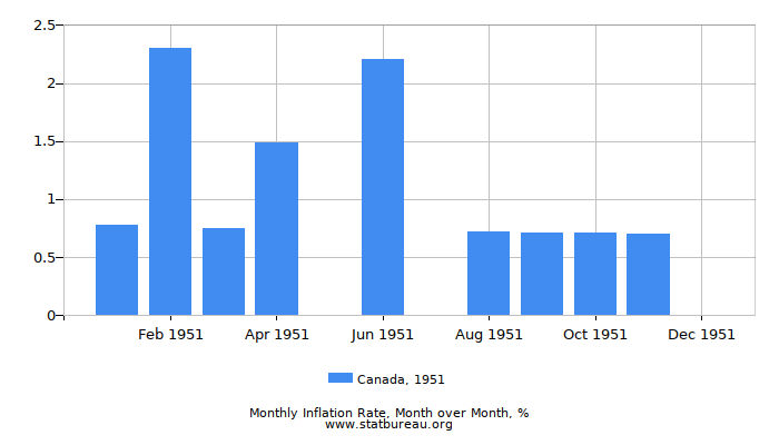 Inflation rate in Canada was 10.85% in 1951. That is 5.12 more than it was in the preceding 1950 and 12.25% more than in the following year of 1952.