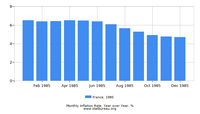 Inflation rate in France was 4.70% in 1985. That is 1.99 less than it was in the preceding 1984 and 2.58% more than in the following year of 1986.