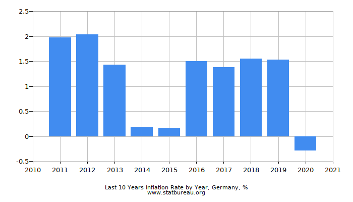 Below are the charts showing the Annual inflation rate in Germany. All of them are based on the data from the Inflation Tables page.