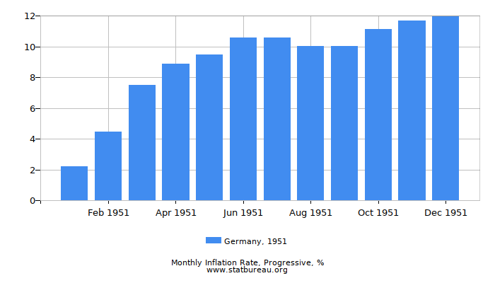 Inflation rate in Germany was 11.98% in 1951. That is 17.25 more than it was in the preceding 1950 and 16.21% more than in the following year of 1952.