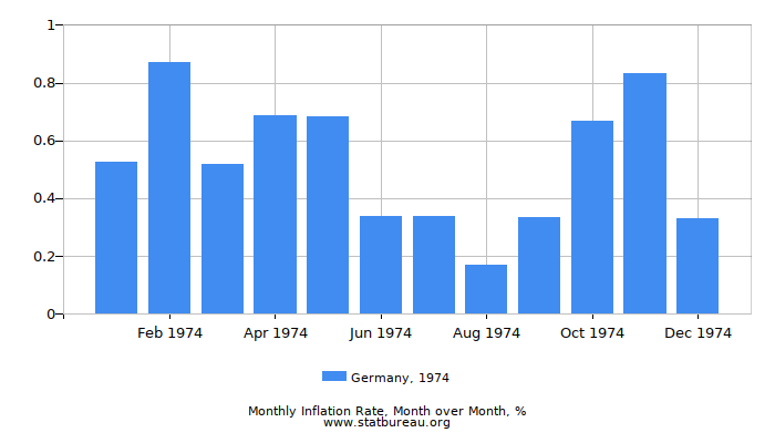 Inflation rate in Germany was 6.48% in 1974. That is 1.05 less than it was in the preceding 1973 and 2.70% more than in the following year of 1975.