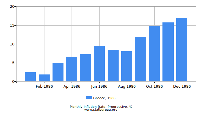 Inflation rate in Greece was 17.00% in 1986. That is 7.82 less than it was in the preceding 1985 and 1.24% more than in the following year of 1987.