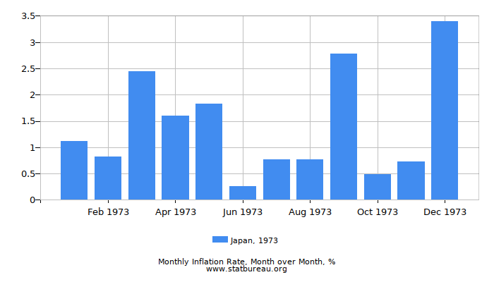 Inflation rate in Japan was 18.33% in 1973. That is 12.76 more than it was in the preceding 1972 and 2.79% less than in the following year of 1974.