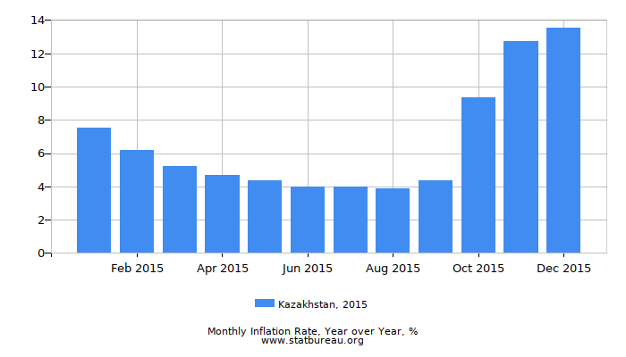In 2015 Kazakhstan ranked #17 in the world by yearly inflation rate.