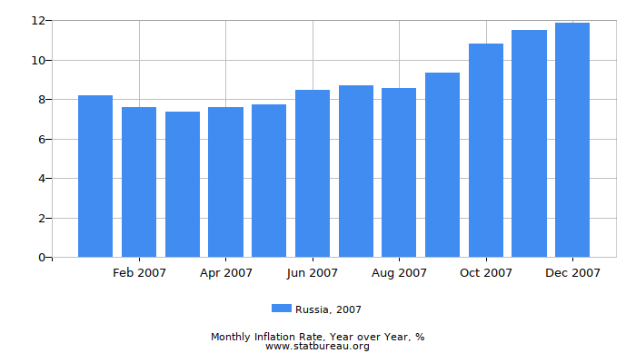 In 2007 Russia ranked #15 in the world by yearly inflation rate.