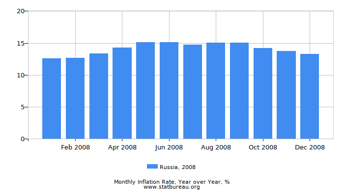 In 2008 Russia ranked #16 in the world by yearly inflation rate.