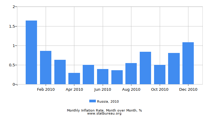 In 2010 Russia ranked #15 in the world by yearly inflation rate.