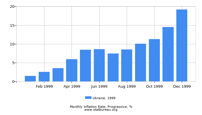 Inflation rate in Ukraine was 19.21% in 1999. That is 0.78 less than it was in the preceding 1998 and 6.60% less than in the following year of 2000.