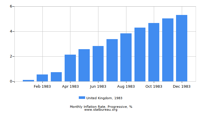 Inflation rate in the United Kingdom was 5.31% in 1983. That is 0.09 less than it was in the preceding 1982 and 0.73% more than in the following year of 1984.
