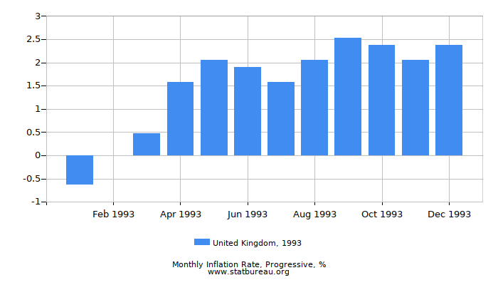 Inflation rate in the United Kingdom was 2.37% in 1993. That is 0.22 less than it was in the preceding 1992 and 0.36% more than in the following year of 1994.