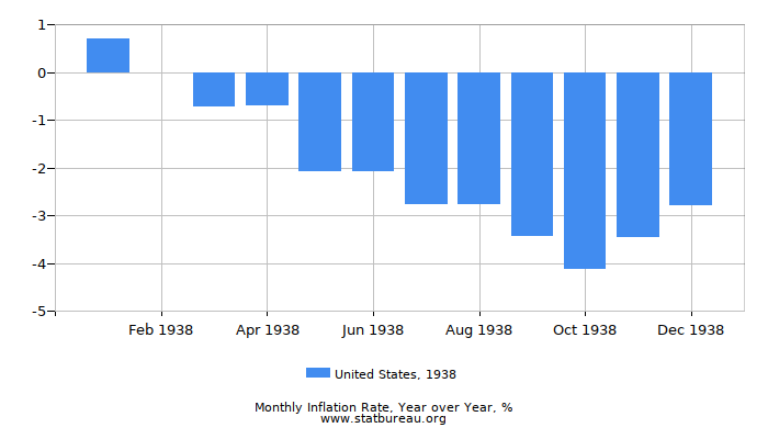Inflation rate in the United States was -2.78% in 1938. That is 5.63 less than it was in the preceding 1937 and 2.78% less than in the following year of 1939.