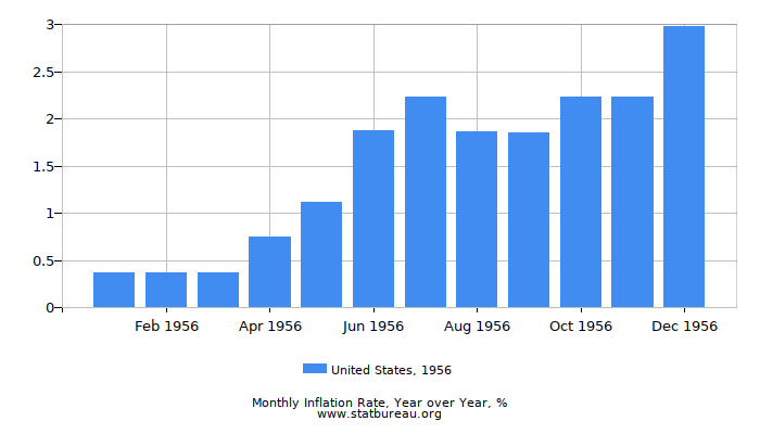 Inflation rate in the United States was 2.99% in 1956. That is 2.61 more than it was in the preceding 1955 and 0.09% more than in the following year of 1957.