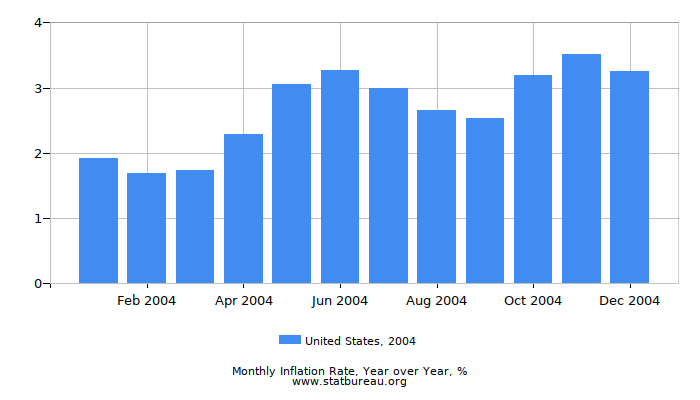 In 2004 USA ranked #10 in the world by yearly inflation rate.