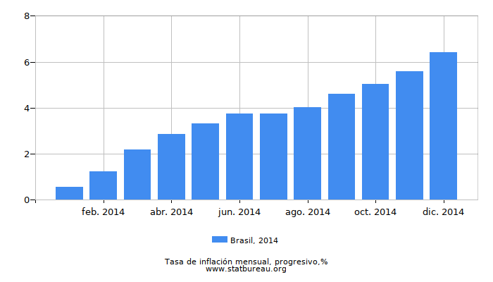 Tasa de inflación en Brasil fue del 6,41% en 2014. Eso es un 0,50 más que en el anterior 2013 y 4,27% menos que en el año siguiente de 2015.