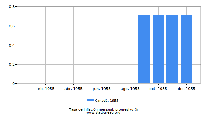 Tasa de inflación en Canadá fue del 0,71% en 1955. Eso es un 0,71 más que en el anterior 1954 y 2,11% menos que en el año siguiente de 1956.