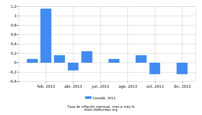 Tasa de inflación en Canadá fue del 1,24% en 2013. Eso es un 0,41 más que en el anterior 2012 y 0,23% menos que en el año siguiente de 2014.