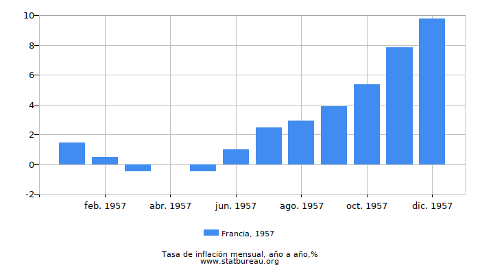 Tasa de inflación en Francia fue del 9,80% en 1957. Eso es un 8,31 más que en el anterior 1956 y 0,43% más que en el año siguiente de 1958.