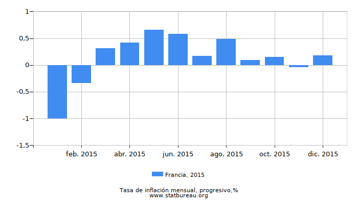 Tasa de inflación en Francia fue del 0,18% en 2015. Eso es un 0,12 más que en el anterior 2014 y 0,43% menos que en el año siguiente de 2016.