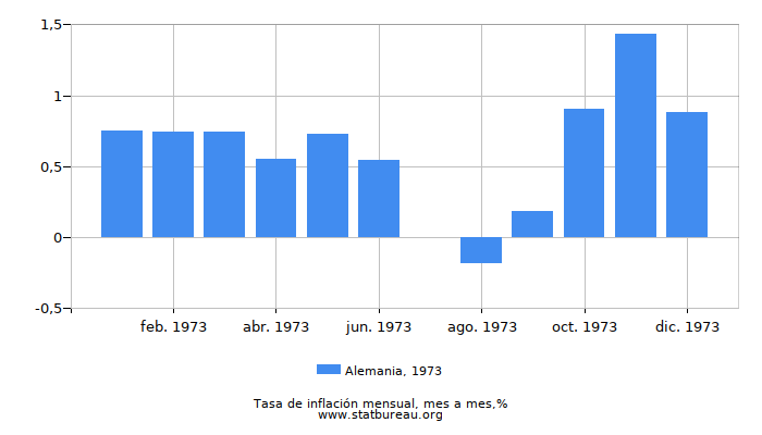 Tasa de inflación en Alemania fue del 7,53% en 1973. Eso es un 1,76 más que en el anterior 1972 y 1,05% más que en el año siguiente de 1974.