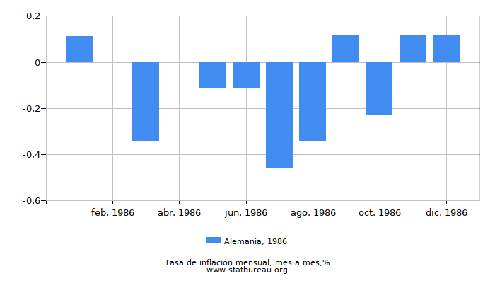 Tasa de inflación en Alemania fue del -1,14% en 1986. Eso es un 2,52 menos que en el anterior 1985 y 1,71% menos que en el año siguiente de 1987.