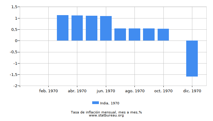 Tasa de inflación en India fue del 5,08% en 1970. Eso es un 1,58 más que en el anterior 1969 y 0,25% más que en el año siguiente de 1971.