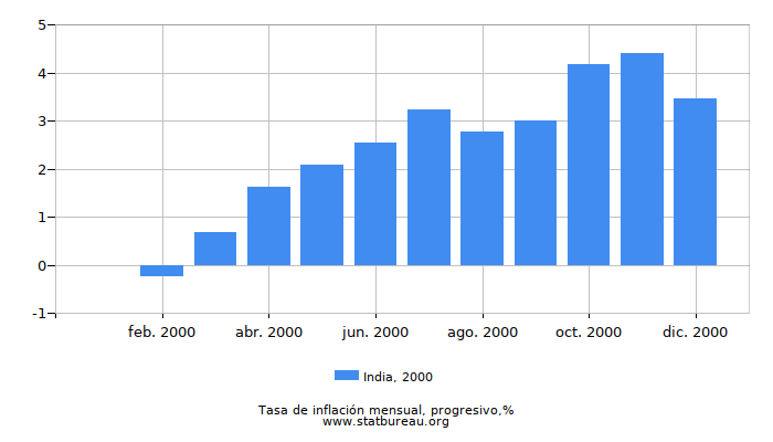 Tasa de inflación en India fue del 3,48% en 2000. Eso es un 3,01 más que en el anterior 1999 y 1,68% menos que en el año siguiente de 2001.