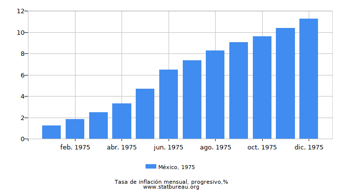 Tasa de inflación en México fue del 11,31% en 1975. Eso es un 9,29 menos que en el anterior 1974 y 15,90% menos que en el año siguiente de 1976.