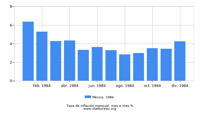 Tasa de inflación en México fue del 59,16% en 1984. Eso es un 21,62 menos que en el anterior 1983 y 4,59% menos que en el año siguiente de 1985.