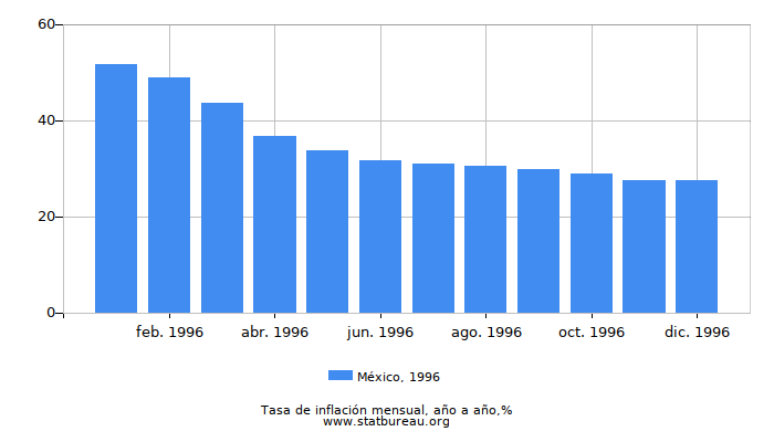 Tasa de inflación en México fue del 27,70% en 1996. Eso es un 24,26 menos que en el anterior 1995 y 11,99% más que en el año siguiente de 1997.