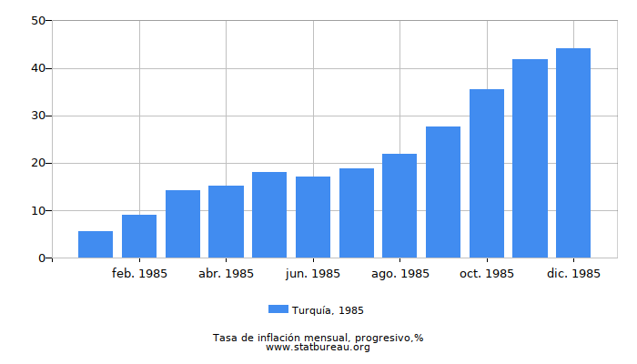 Tasa de inflación en Turquía fue del 44,19% en 1985. Eso es un 5,49 menos que en el anterior 1984 y 13,52% más que en el año siguiente de 1986.