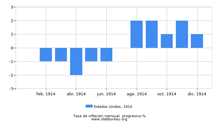 Tasa de inflación en Estados Unidos fue del 1,00% en 1914. Eso es un 1,04 menos que en el anterior 1913 y 0,98% menos que en el año siguiente de 1915.