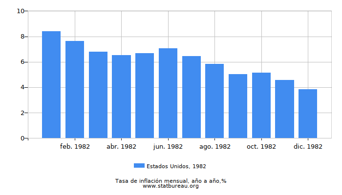 Tasa de inflación en Estados Unidos fue del 3,83% en 1982. Eso es un 5,09 menos que en el anterior 1981 y 0,04% más que en el año siguiente de 1983.