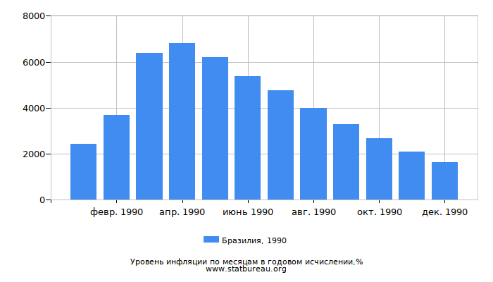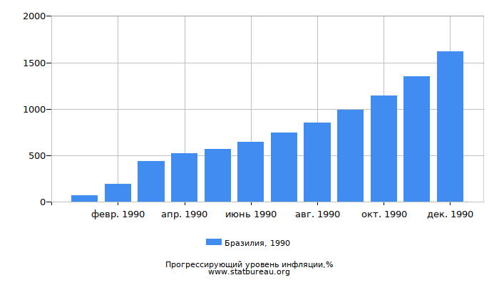В 1990 году уровень инфляции в Бразилии составил 1620,97%, что на 351,95 меньше, чем в предшествующем 1989 году и на 1148,27% больше, чем в следующем 1991.