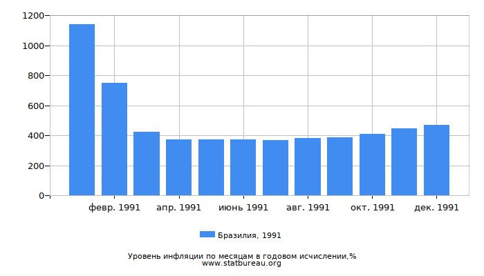 В 1991 году уровень инфляции в Бразилии составил 472,70%, что на 1148,27 меньше, чем в предшествующем 1990 году и на 646,40% меньше, чем в следующем 1992.