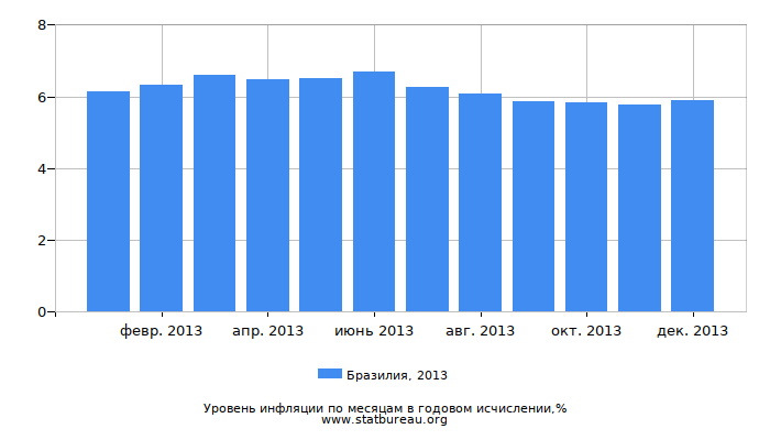 В 2013 году уровень инфляции в Бразилии составил 5,91%, что на 0,07 больше, чем в предшествующем 2012 году и на 0,50% меньше, чем в следующем 2014.