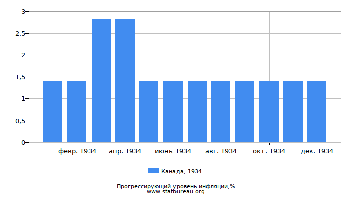 В 1934 году уровень инфляции в Канаде составил 1,41%, что на 4,15 больше, чем в предшествующем 1933 году и на 1,37% меньше, чем в следующем 1935.