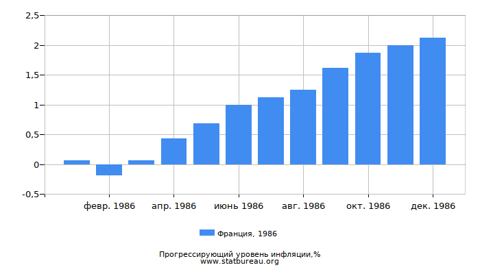 В 1986 году уровень инфляции в Франции составил 2,12%, что на 2,58 меньше, чем в предшествующем 1985 году и на 0,99% меньше, чем в следующем 1987.