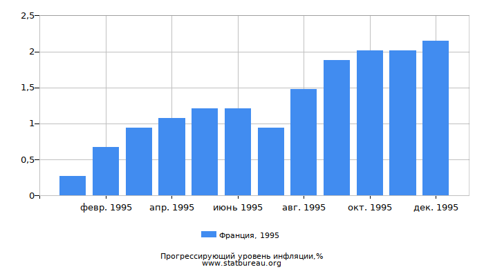 В 1995 году уровень инфляции в Франции составил 2,15%, что на 0,65 больше, чем в предшествующем 1994 году и на 0,57% больше, чем в следующем 1996.