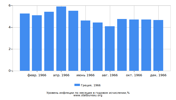 В 1966 году уровень инфляции в Греции составил 4,68%, что на 0,23 меньше, чем в предшествующем 1965 году и на 6,00% больше, чем в следующем 1967.