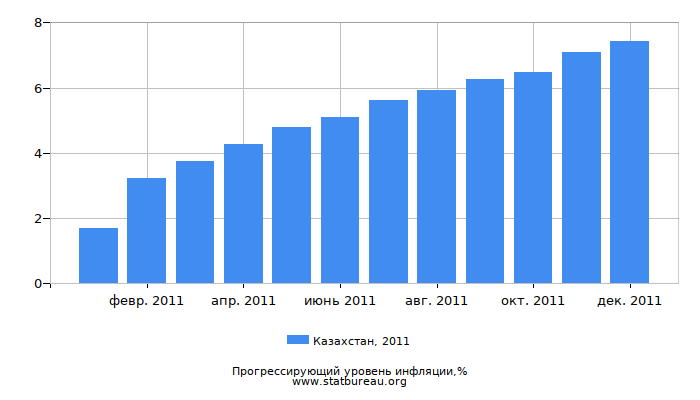 В 2011 году уровень инфляции в Казахстане составил 7,43%, что на 0,54 меньше, чем в предшествующем 2010 году и на 1,37% больше, чем в следующем 2012.
