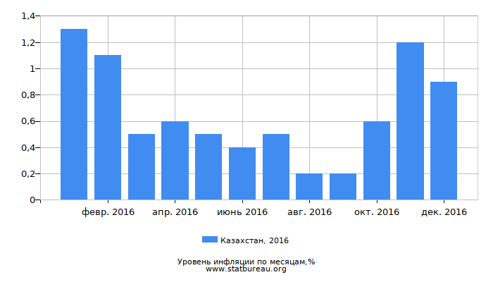 В 2016 году уровень инфляции в Казахстане составил 8,29%, что на 5,23 меньше, чем в предшествующем 2015 году и на 1,07% больше, чем в следующем 2017.