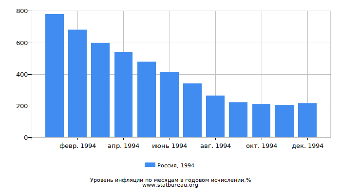 В 1994 году уровень инфляции в России составил 215,02%, что на 624,85 меньше, чем в предшествующем 1993 году и на 83,70% больше, чем в следующем 1995.