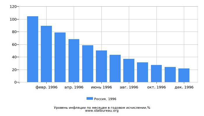 В 1996 году уровень инфляции в России составил 21,81%, что на 109,51 меньше, чем в предшествующем 1995 году и на 10,78% больше, чем в следующем 1997.