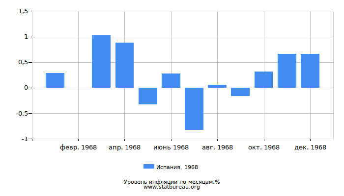 В 1968 году уровень инфляции в Испании составил 2,88%, что на 3,68 меньше, чем в предшествующем 1967 году и на 0,54% меньше, чем в следующем 1969.