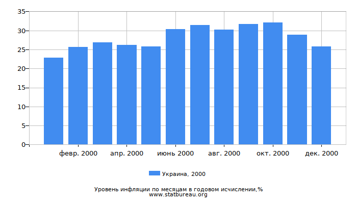 В 2000 году уровень инфляции в Украине составил 25,82%, что на 6,60 больше, чем в предшествующем 1999 году и на 19,69% больше, чем в следующем 2001.