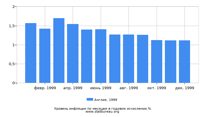 В 1999 году уровень инфляции в Англии составил 1,11%, что на 0,44 меньше, чем в предшествующем 1998 году и на 0,29% больше, чем в следующем 2000.