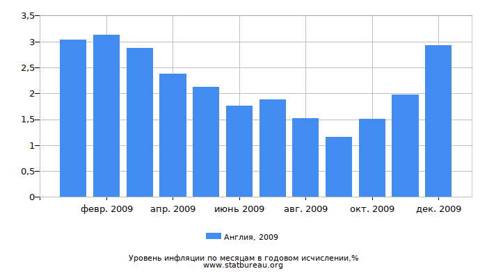 В 2009 году уровень инфляции в Англии составил 2,92%, что на 0,09 меньше, чем в предшествующем 2008 году и на 0,71% меньше, чем в следующем 2010.