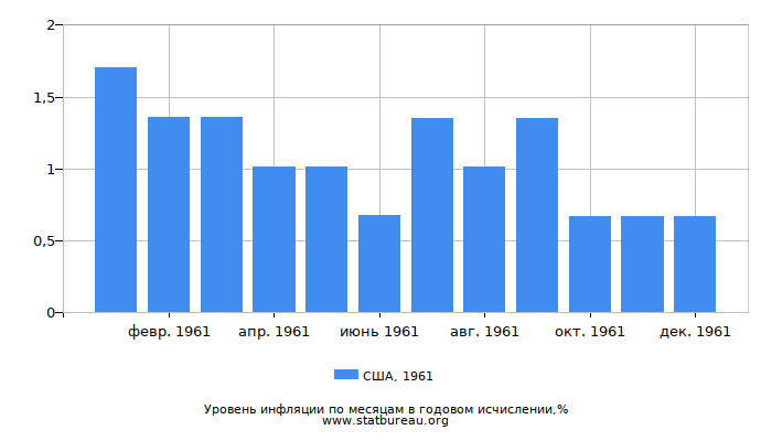 В 1961 году уровень инфляции в США составил 0,67%, что на 0,69 меньше, чем в предшествующем 1960 году и на 0,66% меньше, чем в следующем 1962.