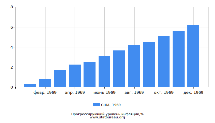 В 1969 году уровень инфляции в США составил 6,20%, что на 1,48 больше, чем в предшествующем 1968 году и на 0,63% больше, чем в следующем 1970.